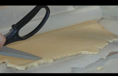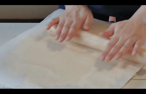 แช่ครบ 20 นาทีให้เอาออกมาวางไว้ตรงพื้นที่นวด เอากระดาษรองด้านบนแล้วนวดไปจนกว่าจะได้ความแบนที่ต้องการ นวดเสร็จลองเอาไม้บรรทัดมาวัด ให้ความสูงของเนื้อแป้งอยู่ที่ 0.7 เซน เกินได้แต่อย่าต่ำกว่านั้น
