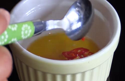 ใส่น้ำตาลน้ำมะนาวน้ำปลาและพริกหั่นลงไปในถ้วย