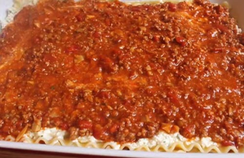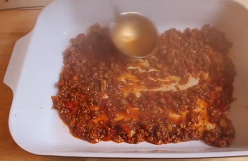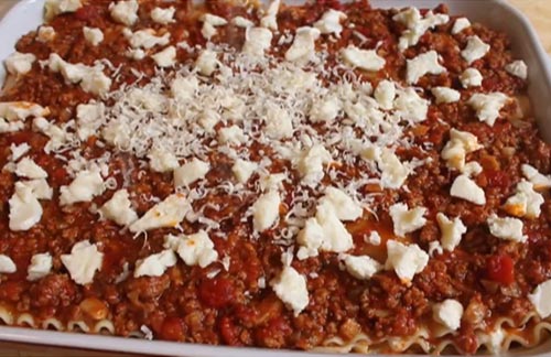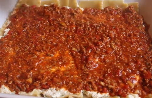 ราดซอสเนื้อให้ทั่วๆและโรยชีสให้ทั่วถึงตามความต้องการ และโรยพาเมซานชีส