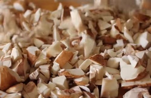 เอาเห็ดใส่ลงหม้อหมู ใส่พริกไทยดำป่น พริกป่นและเกลือแล้วคนๆต่อไป