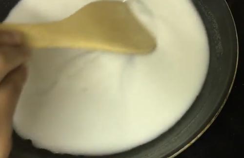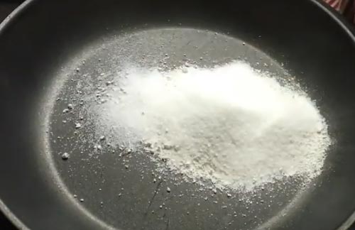 เทแป้งมันและน้ำตาล 2 ช้อนโต๊ะลงกระทะตั้งแก๊สรอเลย ไฟไม่ต้องแรง