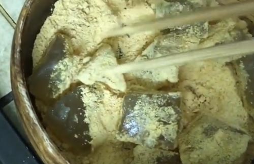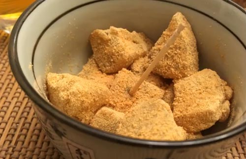 เอาที่หั่นไว้มาคลุกผงถั่วให้ทั่วๆ