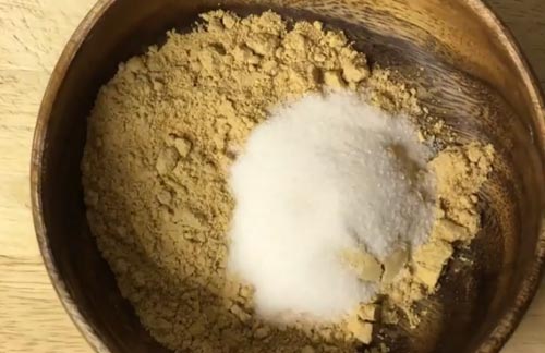 เทผงถั่วลงถ้วยแล้วก็น้ำตาล