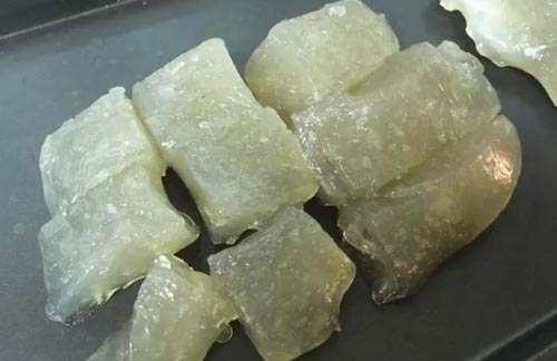 หลังจากเอาขึ้นจากกระทะให้เอาแช่น้ำเย็นหรือแช่ช่องฟีช 20 นาทีก่อนเอาออกมาหั่น