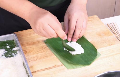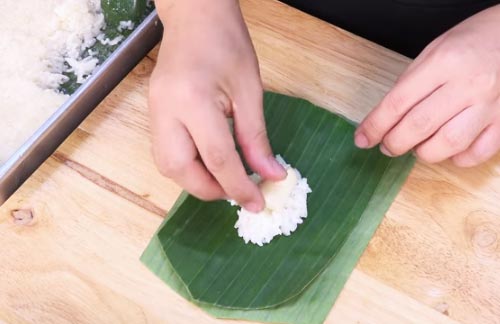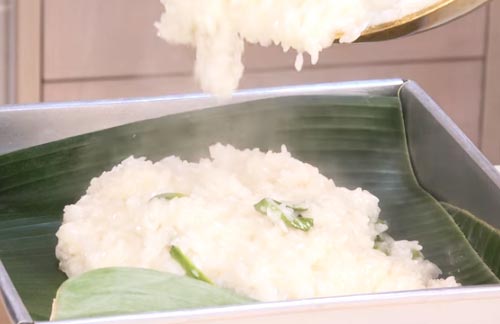 ใช้แผ่นใบตองที่ตัดแล้วสองแผ่นต่อชิ้น ตักข้าวที่ทำไว้ใส่ลงไปในใบตองก่อนช้อนนึง