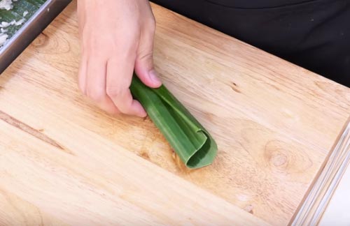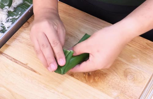 เสร็จแล้วให้ห่อมุมใบตองเข้าหากันโดยให้ปลายอีกด้านนึงยาวกว่า