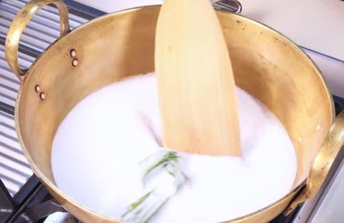 มาทะกระทะต่อ ให้ใส่น้ำกะทิ เกลือและใบเตยลงไปแล้วคนๆให้ทั่ว คนไปเรื่อยๆอย่าหยุด
