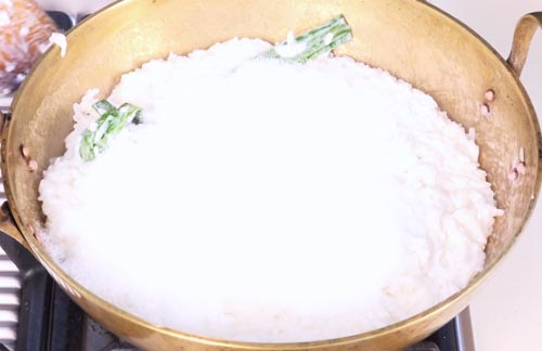 ใส่ข้าวเหนียวที่แช่น้ำแล้วลงไปแล้วคนๆไปเรื่อยๆจนกว่าข้าวเหนียวจะดูดซับน้ำ