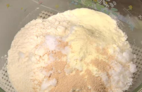 ใส่นมผงน้ำตาลเกลือและยีสต์ลงไปแล้วคนๆรวมกัน