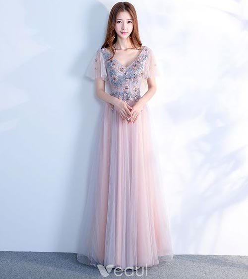 ชุดราตรียาวน่ารักๆสีชมพูมีปีกแขนผ้าระบายสวยๆ งานปักที่เสื้อก็ดีเว่อร์
