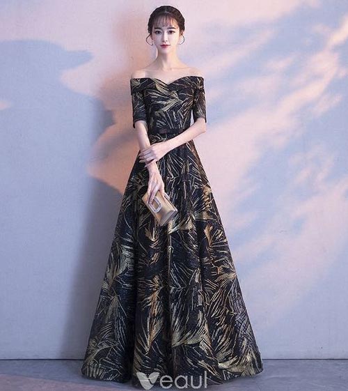 ชุดราตรียาวสีดำผ้าปิดเท้าที่มากับลวดลายเส้นๆสีทองถือคู่กระเป๋าทองอีกสวยงามมากๆเลยค่ะ