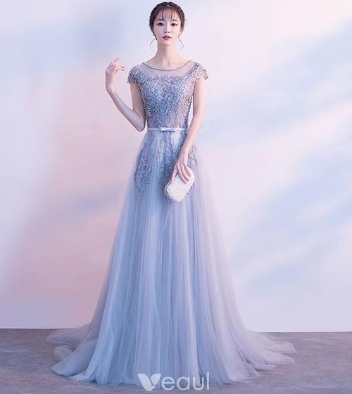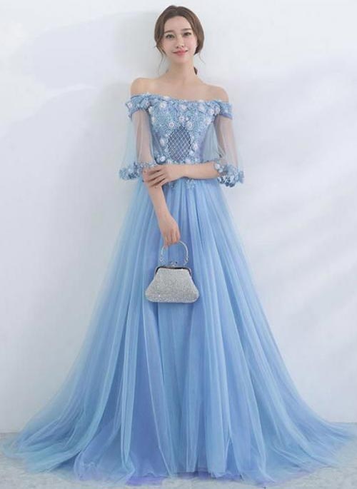 ชุดราตรีกระโปรงยาวสีฟ้าอันสวยฟุ้งดุดดั่งคลื่นน้ำทะเล ดูสวยสดชื่นที่สุดค่ะ