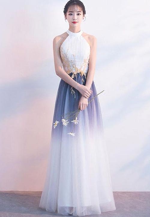 แบบชุดไปงานราตรีสวยๆโทนขาวผสมน้ำเงินดูสวยเหมือนเจ้าหญิงท่ามกลางสายหมอกเลยค่ะ