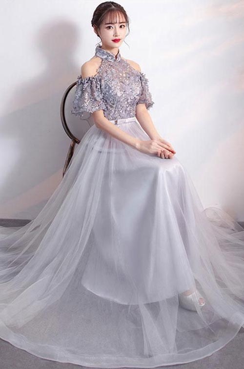 ชุดราตรียาวอลังการต้องนี่เลยค่ะ เป็นชุดคอจีนสีเทาเปิดไหล่เบาๆ กระโปรงก็สวยเสื้อก็งานดีแบบนี้ต้องหามาไว้ใส่แล้วหล่ะ