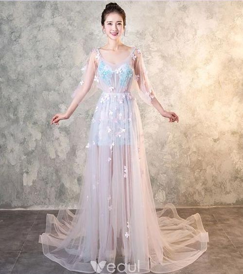 ชุดแต่งผ้าซีทรูยาวๆประดับผีเสื้อสวยๆเหมือนอยู่ท่ามกลางทุ่งดอกไม้สีขาวเลยค่ะ