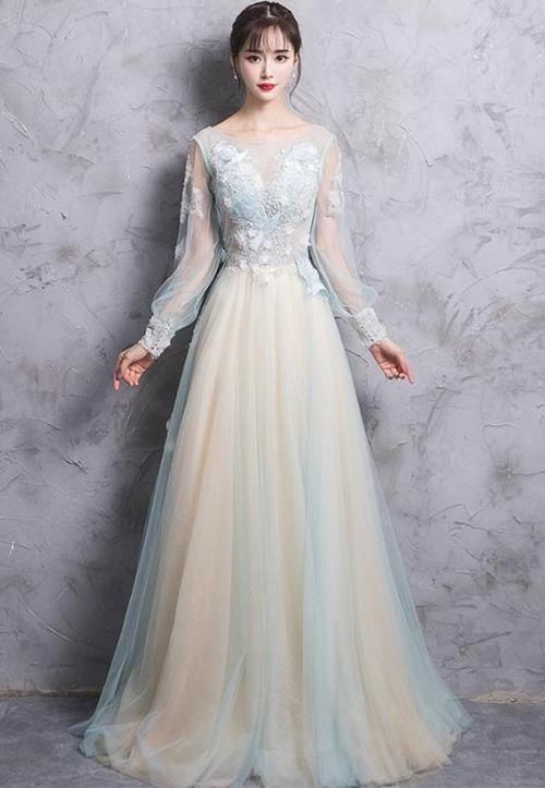 เริ่ดมาแต่ไกล..ชุดราตรียาวผ้าสีผสมอย่างสีฟ้ากับครีมก็สวยแบบไม่จำเจดีค่ะ