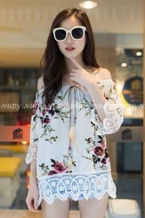 เสื้อฮาวายคอปาดประดับขอบผ้าลูกไม้สีขาวสวยๆมีเชือกห้อยกลางชุดใครได้ใส่ต้องน่ารักมากแน่ค่ะ