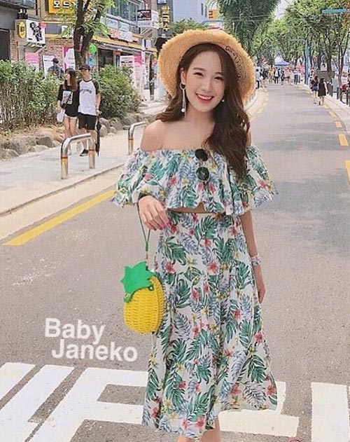 ชุดเดรสฮาวายแยกชิ้นกระโปรงยาวเสื้อเอวลอยผ้าระบายเข้าบรรยากาศไปอีก