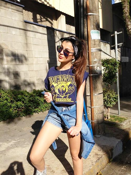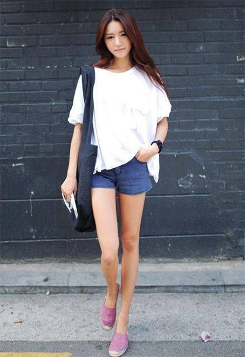 เสื้อตัวใหญ่สีขาวกับกางเกงสั้นสีน้ำเงิน เพิ่มเติมด้วยรองเท้าสวมสีชมพูอย่างแนวเลยคะ ปล่อยผมเต็มที่เลยคะ