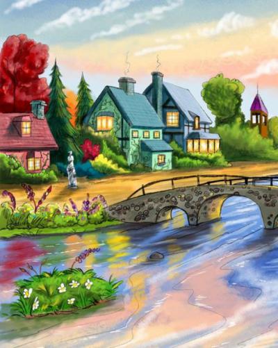 อีกหนึ่งภาพวาดบ้านการ์ตูนสวยๆมาพร้อมแม่น้ำสนามหญ้าสุดเริ่ด ฟินเจ้าค่ะ