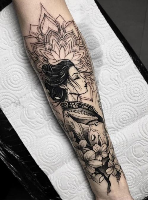 รูปสาวสวยชุดกิโมโนแนวรูปสีดำสวยๆภาพลายเส้นที่ดูจัดเต็มเรื่องการตกแต่งบนแขน เป็นลายสักที่งดงามมาก