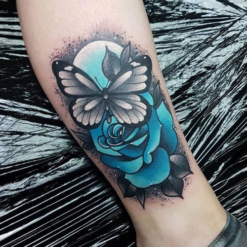 รูปผีเสื้อกับกุหลาบสีฟ้า เป็นลายสักสองสีที่ดูเย็นและสวยมาก