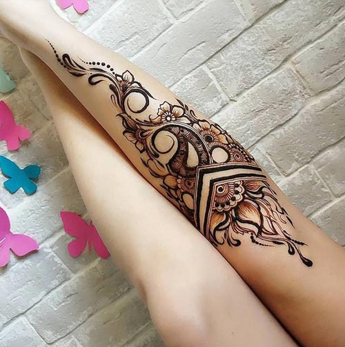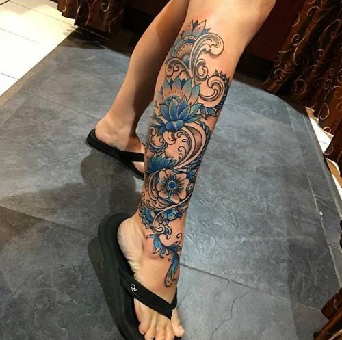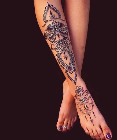 ลายสักที่ขาสุดเลิศที่สักเกือบถึงปลายเท้าแต่ดูเป็นลายที่สวยงามอย่างกับเครื่องประดับเลยจ้า