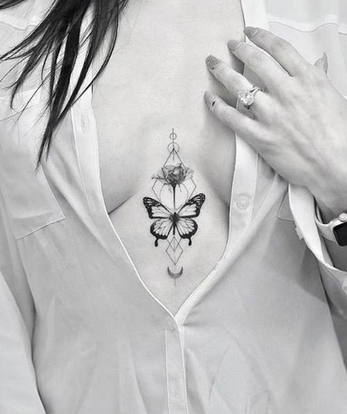 ลายสักหน้าอกตรงระหว่างกลางลายผีเสื้อดอกไม้และเส้นกราฟฟิกเบาๆคือดี