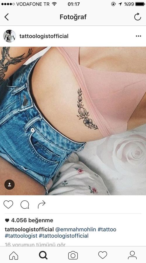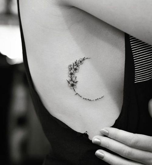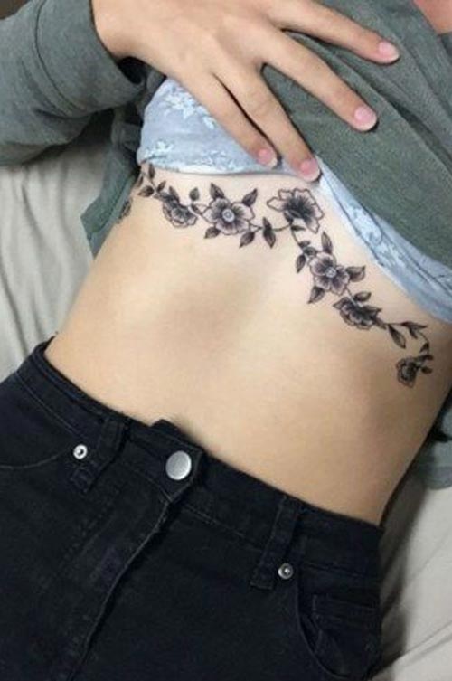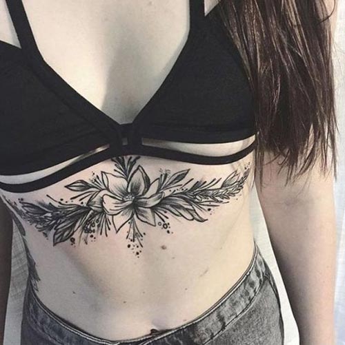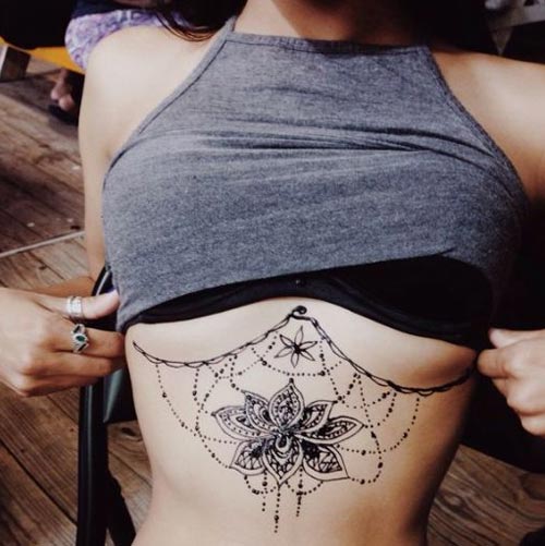 ลายสักใต้หน้าอกลวดลายกราฟฟิกสวยๆภาพดอกไม้ตกแต่งเส้นประกลมๆแบบนี้ดูเก๋นะคะ