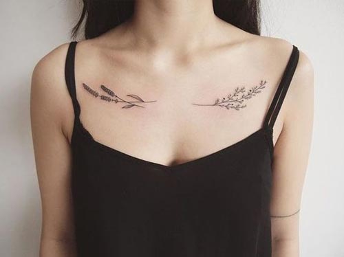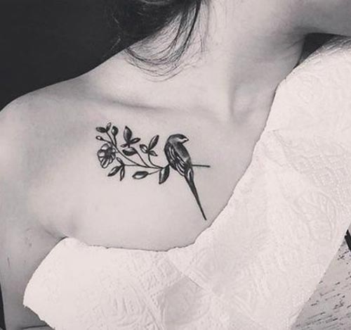 ลายสักหน้าอกแบบอยู่ด้านบนลายเล็กๆอย่างรูปนกเกาะกิ่งดอกไม้ดูน่ารักดี