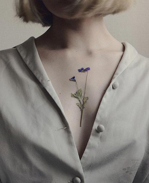 ลายสักกลางหน้าอกลายก้านดอกไม้สีม่วงเล็กสวยดีนะ