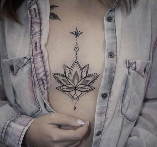 รูปดอกบัวภาพลายเส้นกราฟฟิกบางสวยมาก สักผ่ากลางได้แบบสบายๆเล็กถ้าคนอกเล็กอะนะ