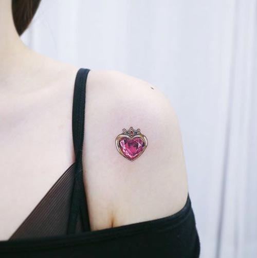 รูปเพชรทรงหัวใจสีชมพูขอบทองดูงดงามมาก สักตรงไหล่ดูมีเสน่ห์ขึ้นไปอีก
