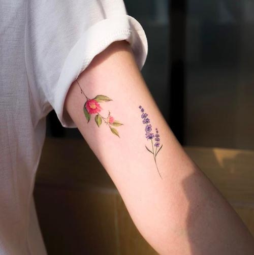รูปก้านดอกไม้สีม่วงและก้านดอกไม้สีแดงใบเขียวสดสวยเข้ากับแขนดี