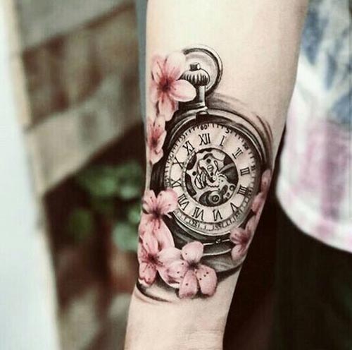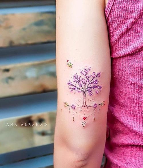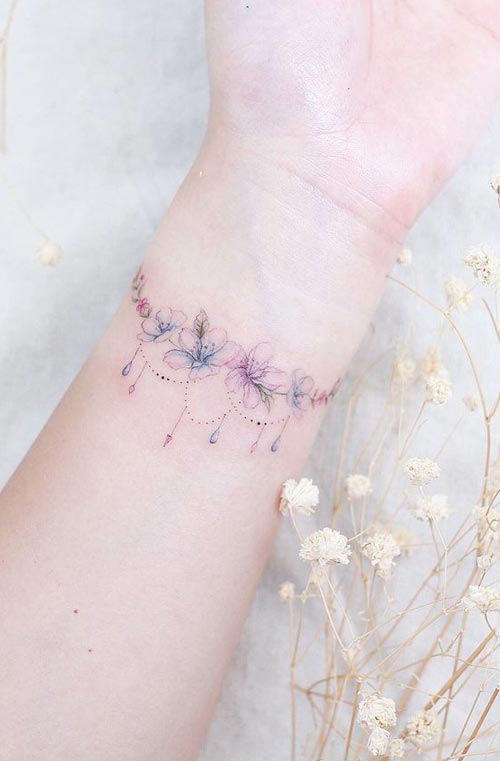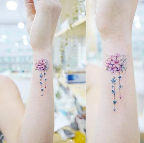 สักที่แขนรูปพุ่มดอกไม้เล็กๆโทนสีฟ้ากับชมพูแบบอ่อนหวาน มีที่ห้อยๆดูน่ารักมาก