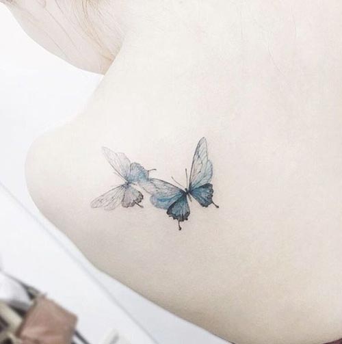 รูปผีเสื้อทั้งสองปีกบางสวย สักด้านหลังแบบนี้ยิ่งเป็นสีฟ้าด้วยดูอ่อนโยนเหมาะกับผู้หญิงสุดๆ
