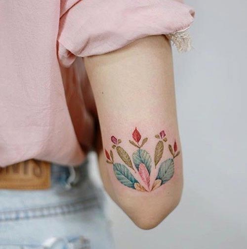 รูปใบไม้หลากสีสไตล์วินเทจ สักไว้หลังแขนเพิ่มความเก๋ให้ตัวเราได้ดีเลย