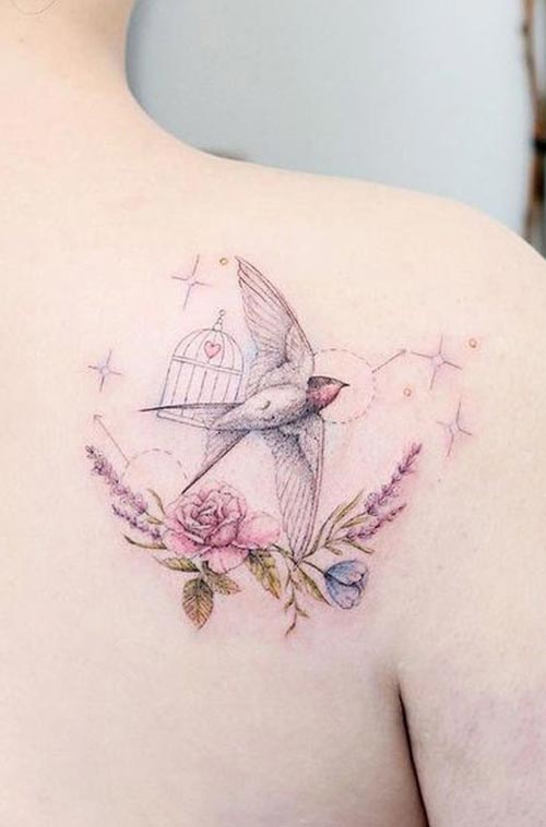 รอยสักรูปนกกับกรงนกสวยๆมีตกแต่งเอฟเฟคและดอกไม้ให้ดูงดงามขึ้นด้วยจ้า
