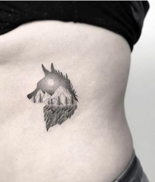 รูปหน้าหมาป่าภาพเงาจางๆมีวิวภูเขาและต้นไม้ในใบหน้าดูงานดีจัง