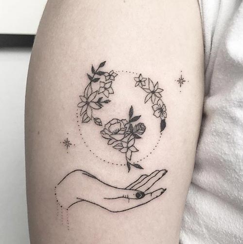 รูปดอกไม้ในวงกลมเส้นประ มีมือประคองด้านล่างดูลงตัวและละมุนสุดๆ