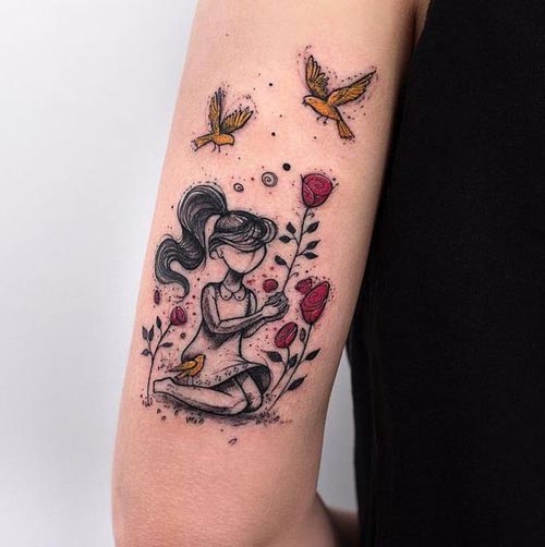 งานอาร์ตน่ารักๆอย่างรูปเด็กผู้หญิงกับดอกไม้และนกเป็นภาพสักที่ดูแล้วก็ต้องยิ้มให้กับความน่ารักเลย