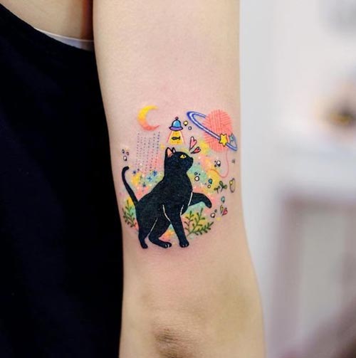 รูปแมวสีดำกับลวดลายต่างๆที่มีทั้งดาว จานบิน ใบไม้ หัวใจ ล้วนเป็นลายที่สีสวยสดใสมากจ้า