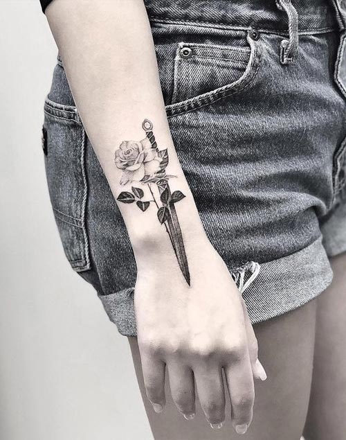รูปมีดกับดอกกุหลาบพออยู่คู่กันแล้วดูเป็นรอยสักที่สวยแซ่บมากค่ะ